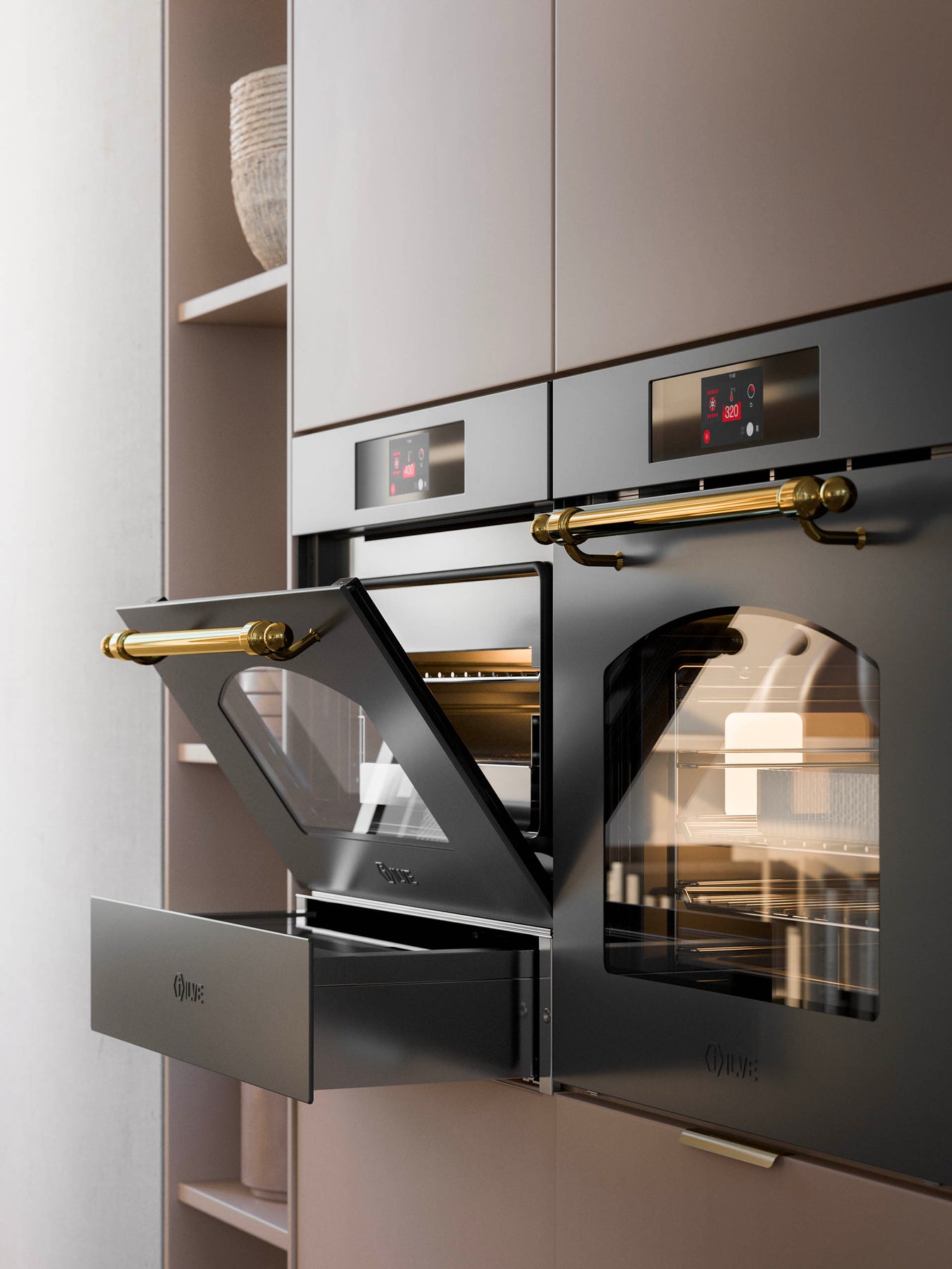 Nostalgiovn har den karakteristiske buede ovndør, fås i 6 farver - hvid, antik hvid, rustfri stål, grafit mat, rød og blå grå. Grebne er de klassiske i messing, krom eller bronze. Hydrolytisk rengøring. Passer fint til Nostalgi komfur og indbyggede kogeplader. Ovnene leveres med ILVEs nyeste ovn inde med let rengøringsbelægning, blødlukkende ovndøre og dobbelt store ovnlamper.